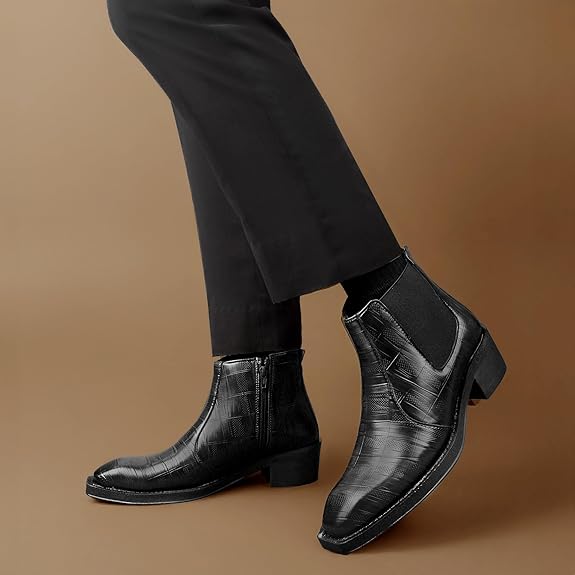 Enhance your everyday style with the JonasParamount Men’s Height Increasing Chelsea Boots, designed for modern comfort and versatile fashion. Crafted from textured faux leather, these ankle-length boots deliver a refined look suitable for both casual and formal occasions. The slip-on Chelsea design allows easy wear, while the 2-inch block heel provides a subtle height increase along with stable support. A cushioned inner lining and lightweight construction help maintain comfort throughout the day. Whether paired with jeans, trousers, or formal outfits, these boots offer a practical combination of style, durability, and everyday usability.