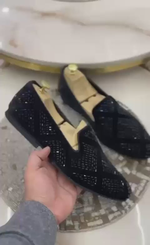 The JonasParamount Premium Collection presents these luxurious black loafers, showcasing high-quality craftsmanship. These loafers are expertly handmade with intricate studded mirror work that adds a sophisticated touch of elegance. Featuring a durable black TPR sole, these loafers provide long-lasting comfort while maintaining a sharp, fashionable look. Available in UK sizes 6 to 10, they are perfect for those seeking both style and reliability in their footwear.